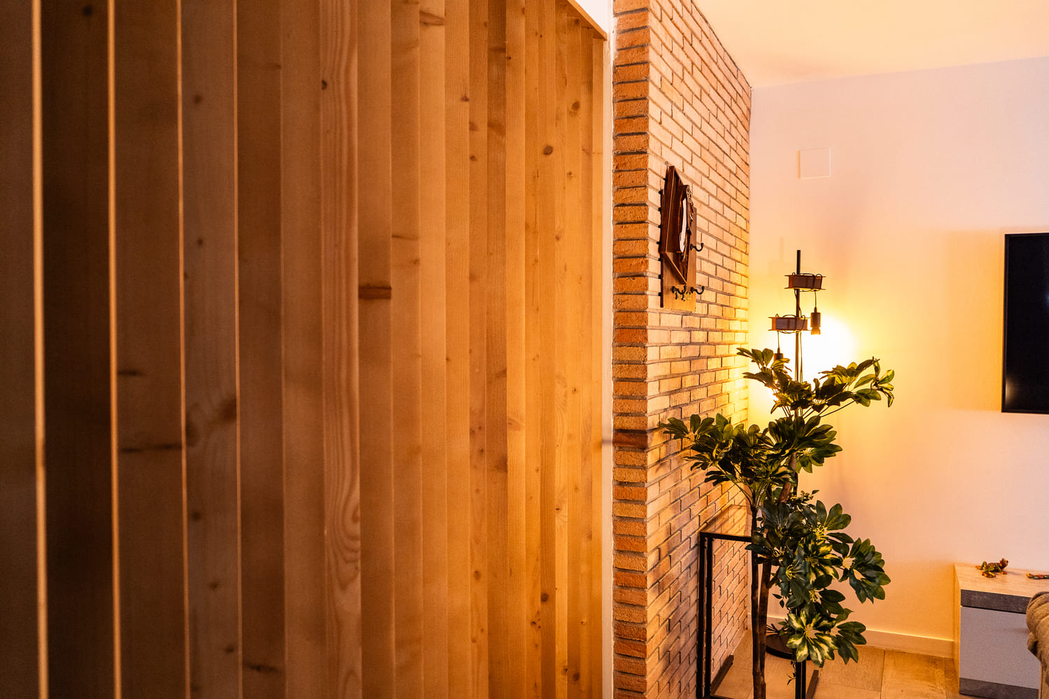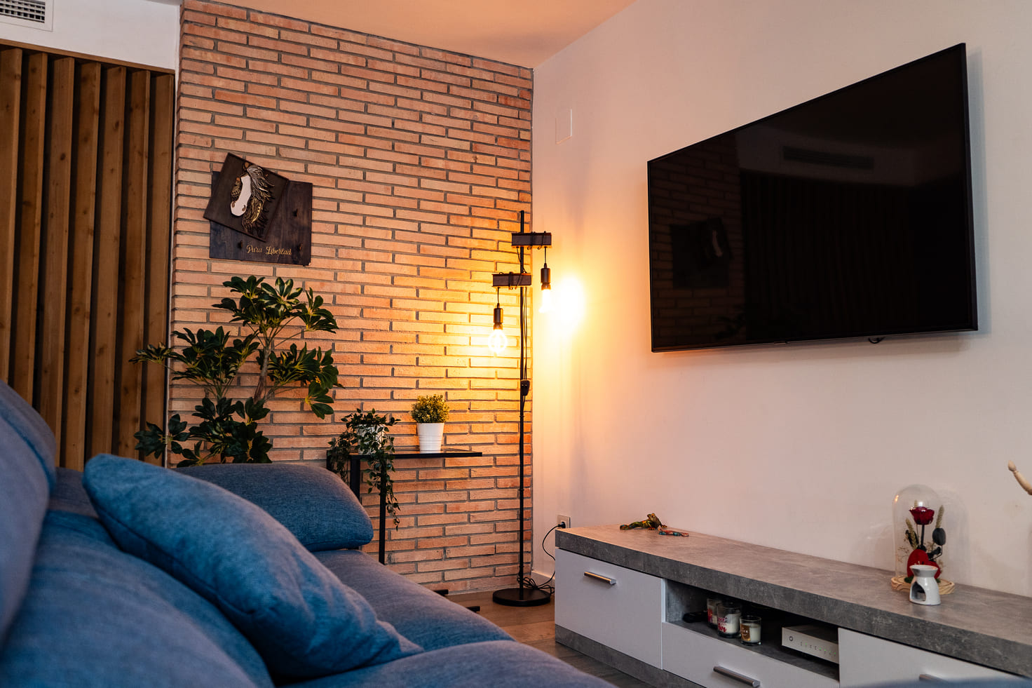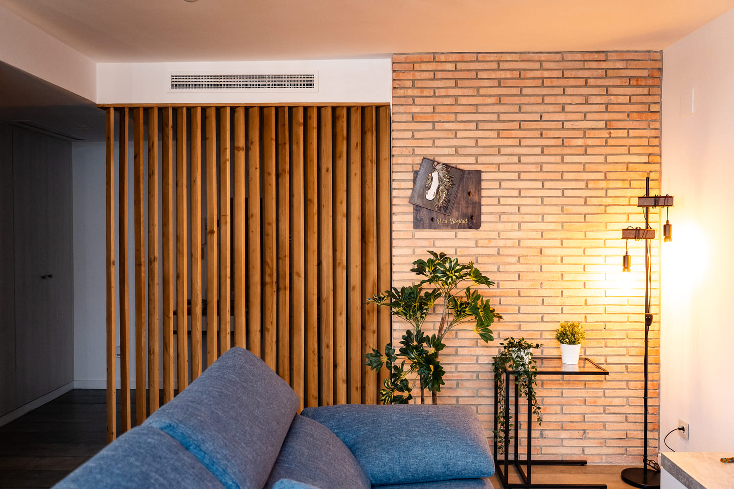 Como elemento distintivo, incorporamos una pared decorativa de ladrillo cara vista que aporta carácter y un toque industrial-contemporáneo al conjunto.