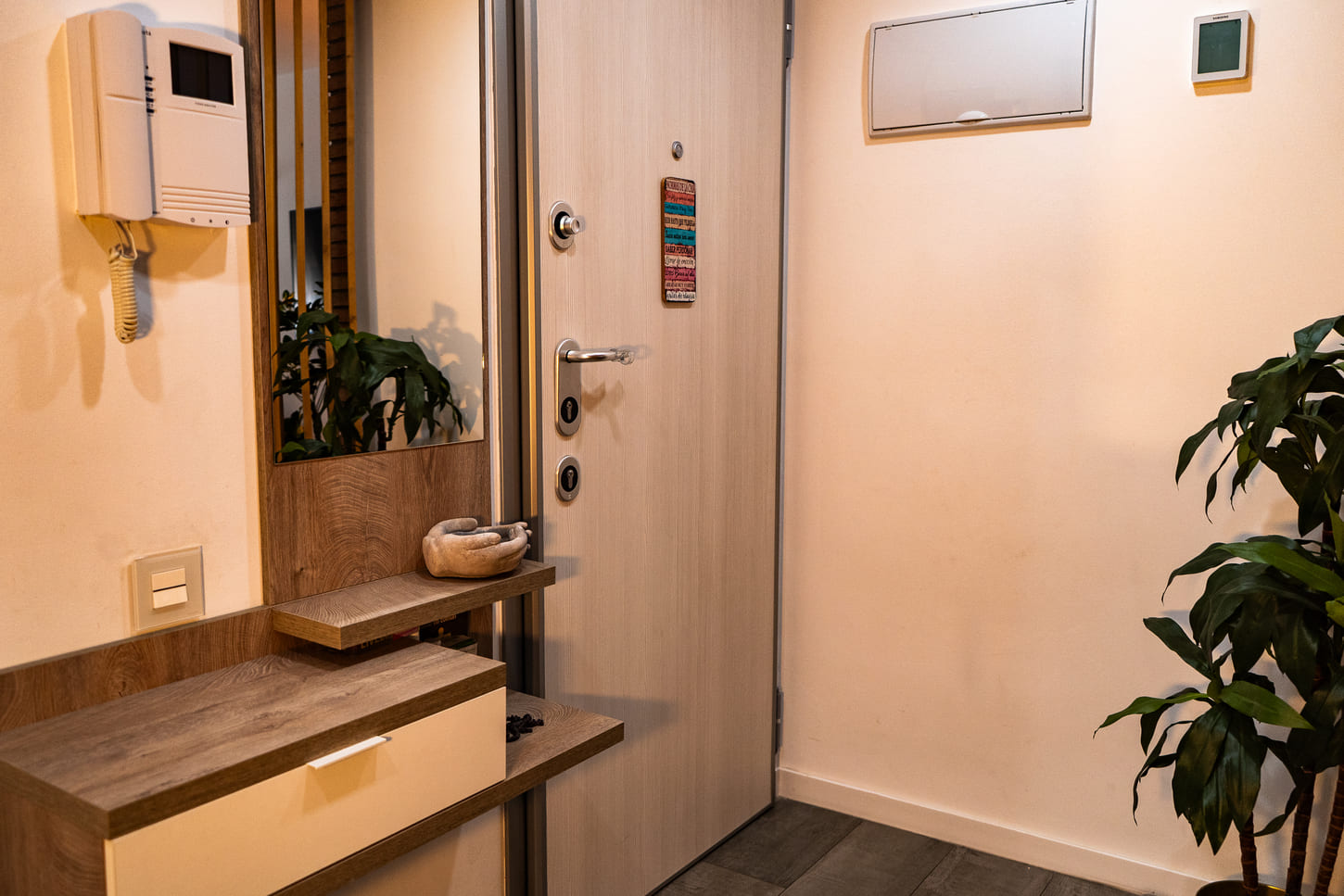 La seguridad y el aislamiento fueron prioritarios en esta reforma. Sustituimos la antigua puerta de entrada por una puerta blindada de alta seguridad. Además, cambiamos todas las puertas de paso y las puertas de los armarios empotrados, unificando el estilo en toda la vivienda.